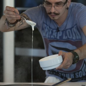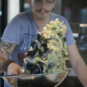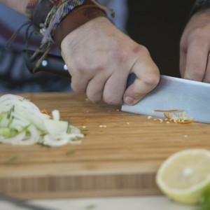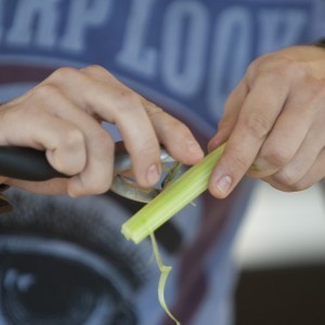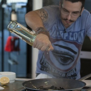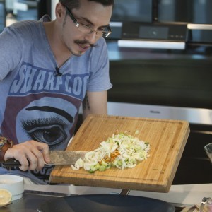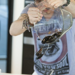 Cu ajutorul unui burete de sârmă curățăm midiile sub jetul de apă până când algele și depunerile marine de pe aceastea sunt înlăturate.Odată curățate midiile, cu ajutorul peeler-ului curățăm delicat tulpinile de apio și le tocăm grosier, păstrând frunzele pentru decor. Tocăm grosier un cățel de usturoi zdrobindu-l cu lateralul cuțitului apoi ceapa albă, chives-ul, ardeiul iute și fenelul.