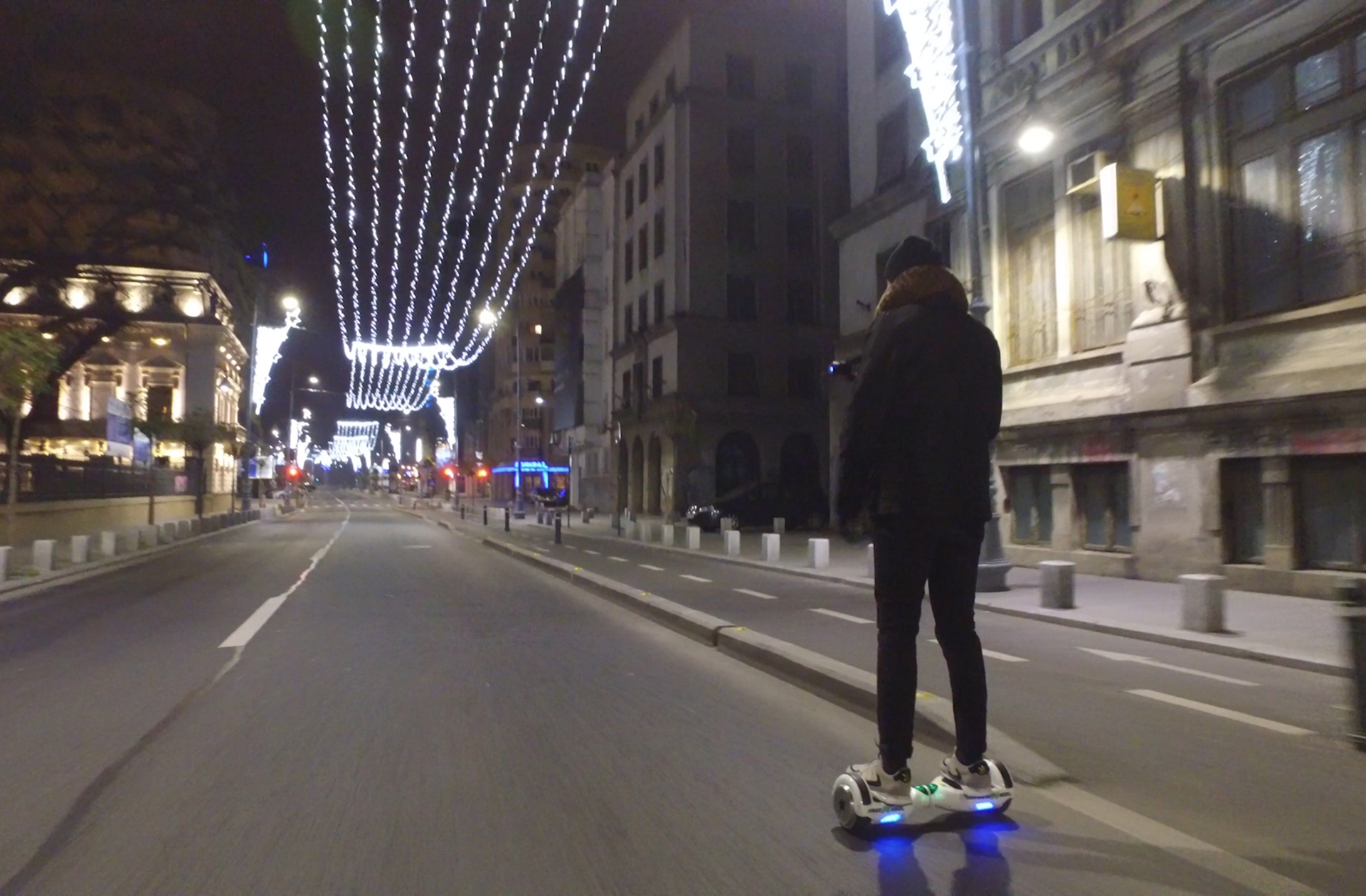Am luat Calea Victoriei la… pas și am ieșit apoi pe Bulevardul Magheru, pustiu, așa cum îl visează toți șoferii ziua. Eram noi, și autobuzul de noapte. Normal că șoferul a oprit curios să ne întrebe ce se întâmplă. Se filma cumva Star Wars la București? Totul a fost făcut de pe jucăria care m-a făcut să mă simt excelent: Freewheel. O placă prinsă în două roți laterale pe care te înclini spre ce direcție vrei și ea te duce acolo. Acum gândește-te cât de distractiv a fost: Bucureștiul liber, o chestie cu roți care merge tare, și o filmare făcută cu telefonul. Adaugă căzăturile luate, picioarele înghețate și zâmbetul de copii care nu ni s-a luat de pe fețe. Cu siguranță pe asta am cui să o povestesc.